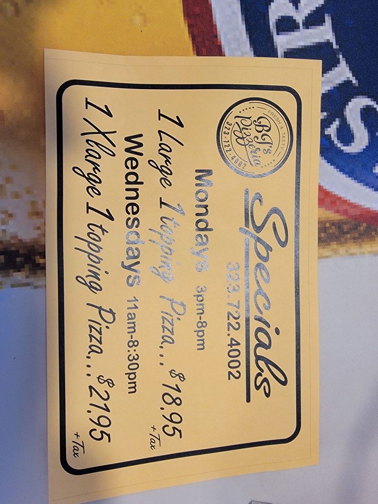 Welcome to BJ’s Pizzeria, a beloved gem located at 1424 W Beverly Blvd, Montebello. As you step inside, you’ll find a vibrant atmosphere that’s perfect for family gatherings or casual outings with friends. The menu tantalizes with a variety of offerings, including mouthwatering pizzas, crispy chicken wings, and fresh salads.